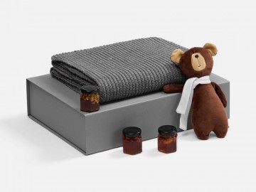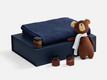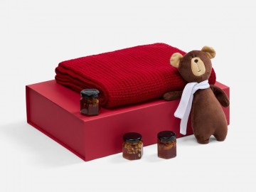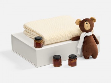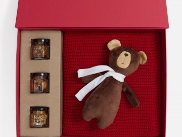 Милый мишка в шарфике с целой коллекцией разнообразного ароматного меда идеально дополняет основной, более практичный подарок — объемный шарф из толстой пряжи, который впишется в любой зимний образ.