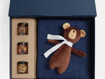 Милый мишка в шарфике с целой коллекцией разнообразного ароматного меда идеально дополняет основной, более практичный подарок — объемный шарф из толстой пряжи, который впишется в любой зимний образ.