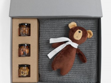 Милый мишка в шарфике с целой коллекцией разнообразного ароматного меда идеально дополняет основной, более практичный подарок — объемный шарф из толстой пряжи, который впишется в любой зимний образ.