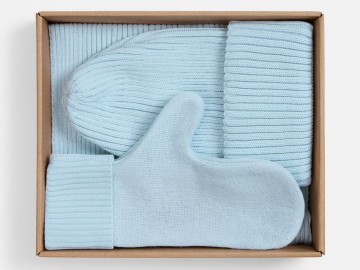 В набор входят удобный шарф с технологичным отверстием для быстрого завязывания, шапка с двойным отворотом и теплые двухслойные варежки с широкой манжетой. Все изделия связаны из акриловой пряжи, отличаются практичностью и элегантной простотой.