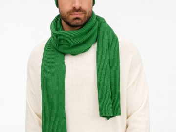 Удлиненная шапка с широким отворотом и фактурной вязкой мягко облегает голову, создавая элегантный силуэт. Широкий шарф с выразительным рельефом позволяет экспериментировать с драпировками, добавляя образу объем и динамику. Перчатки с аккуратной резинкой на манжете обеспечивают идеальную посадку и тактильный комфорт.