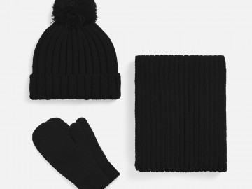 Шапка с пышным помпоном и отворотом, связанная крупной резинкой, создает игривый силуэт, а широкий шарф с выразительной текстурой надежно защищает от ветра, сохраняя свободу движений. Варежки с отворотом-резинкой плотно облегают запястье, не пропуская холод.