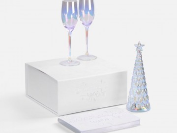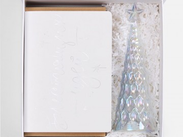 Секрет прост: это особенное перламутровое напыление бокалов и стеклянной елочки-светильника, а еще серебристое голографическое тиснение на самой упаковке и ежедневнике с главным — и всегда актуальным — пожеланием. В такой компании блестящие идеи, без сомнения, будут посещать намного чаще, чем обычно, а весь год будет окрашен в яркие тона, искрящиеся радостью!