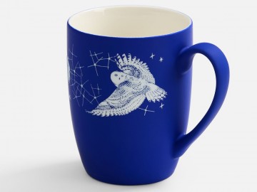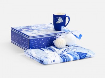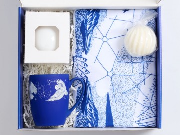 Изящная гравировка с парящими совами на кружке дополняет композицию, а лента елочного шара украшена небесным орнаментом — созвездиями и всполохами сияния. Так магии Севера становится еще больше, а весь набор вызывает приятный трепет. Тонкие линии, будто выведенные вручную, придают ему графичную изысканность.