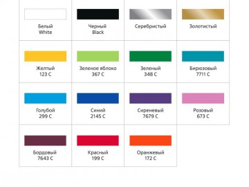 - Цвет печати: белый, черный, красный, желтый, синий, оранжевый, зеленый, розовый, золотистый, серебристый — все цвета без точного оттенка по Pantone