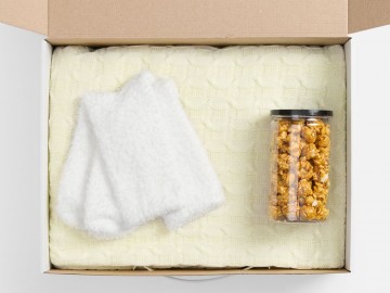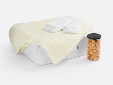 Нотка хрустящего удовольствия в сладком попкорне, обволакивающее тепло пледа с геометрическим узором и мягких пушистых носков — идеальное комбо для уютного вечера и великолепного времяпрепровождения.