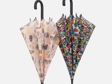 В стоимость входят запечатка полотна бесшовным паттерном методом сублимации, раскрой, пошив купола и сборка изделия. В основе зонта использован каркас с цветными элементами на спицах.