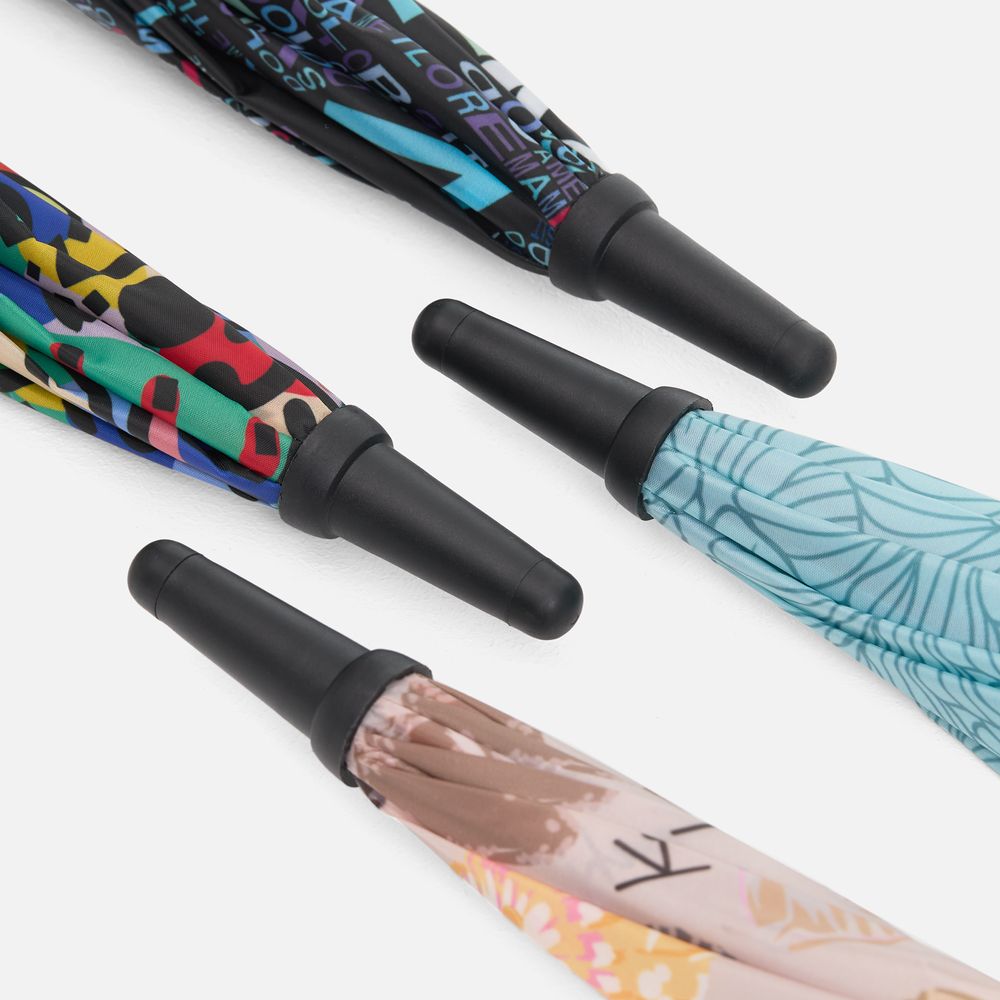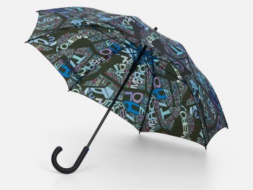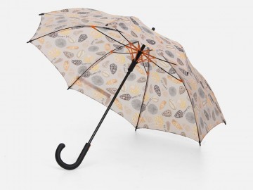 В стоимость входят запечатка полотна бесшовным паттерном методом сублимации, раскрой, пошив купола и сборка изделия. В основе зонта использован каркас с цветными элементами на спицах.