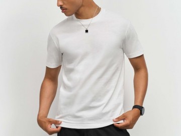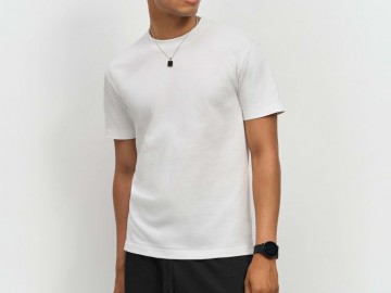 Ткань хорошо держит форму и не просвечивает, при этом футболка остается мягкой и приятной к телу. Особенности обработки волокна и конструкция с заметной высокой горловиной создает аутентичный образ с винтажной фактурой.